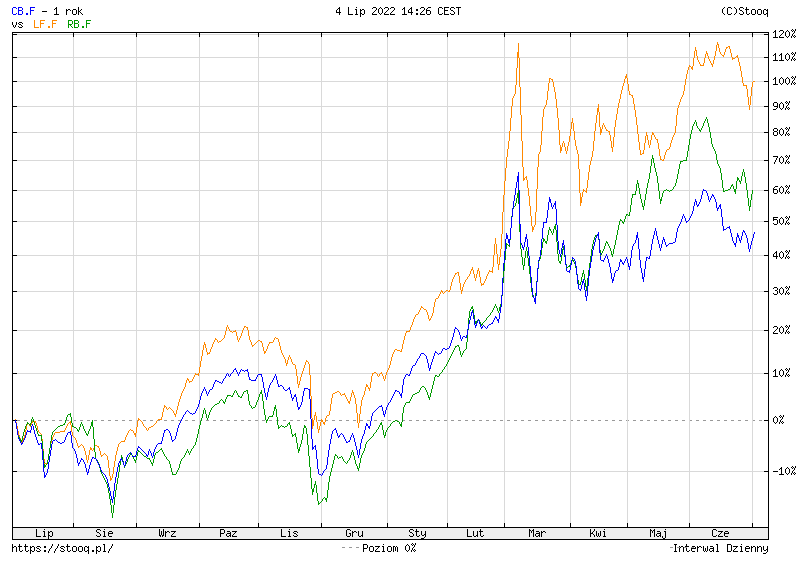 Powyższy wykres nieco usprawniłem. Nałożyłem na niego dwie krzywe. Niebieska obrazuje wzrost ceny ropy naftowej. Wykres raz jest nad krzywą, raz pod nią – normalne wahania na rynku. Natomiast aktualnie jest tuż nad nią. To pokazuje, że to nie wojna jest winna. Od 2 lat ropa naftowa drożeje – mniej więcej w takim samym stopniu. Na początku wojny – to prawda – gwałtownie podrożała, ale potem wróciła do swojego poziomu. Teraz wykres jest już nad krzywą – ale niewiele.