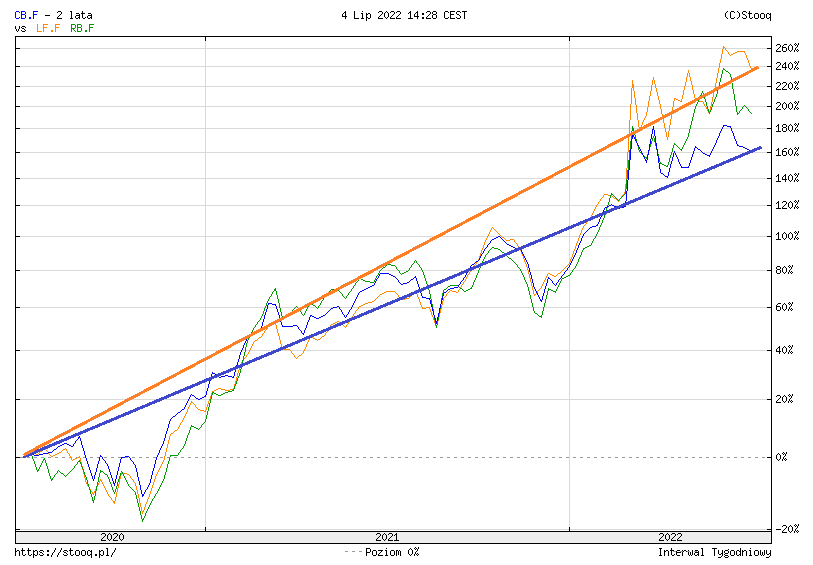 Poniżej zaprezentuję wam pierwszy wykres. W kolorze niebieskim zaznaczona jest krzywa dotycząca cen ropy naftowej. Kolor zielony to benzyna, zaś kolor pomarańczowy to diesel. Krótko mówiąc, wykres ten obrazuje jak procentowo zmieniała się wartość – czy coś taniało, czy drożało. Pokazuje poziom wzrostów względem siebie.