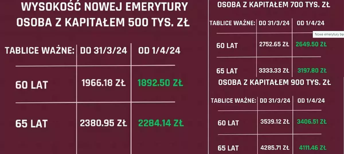 Jak widać parametr, jakim jest średnia długość życia, która się wydłużyła, ma wpływ na emerytury wyliczone na podstawie nowych tablic. Te będą niższe od tych, które wyliczono na podstawie tablic obowiązujących do końca marca 2024 r. Ponadto jak widzimy, im wyższy zgromadzony kapitał, tym większe są różnice w wysokości wyliczanej emerytury.